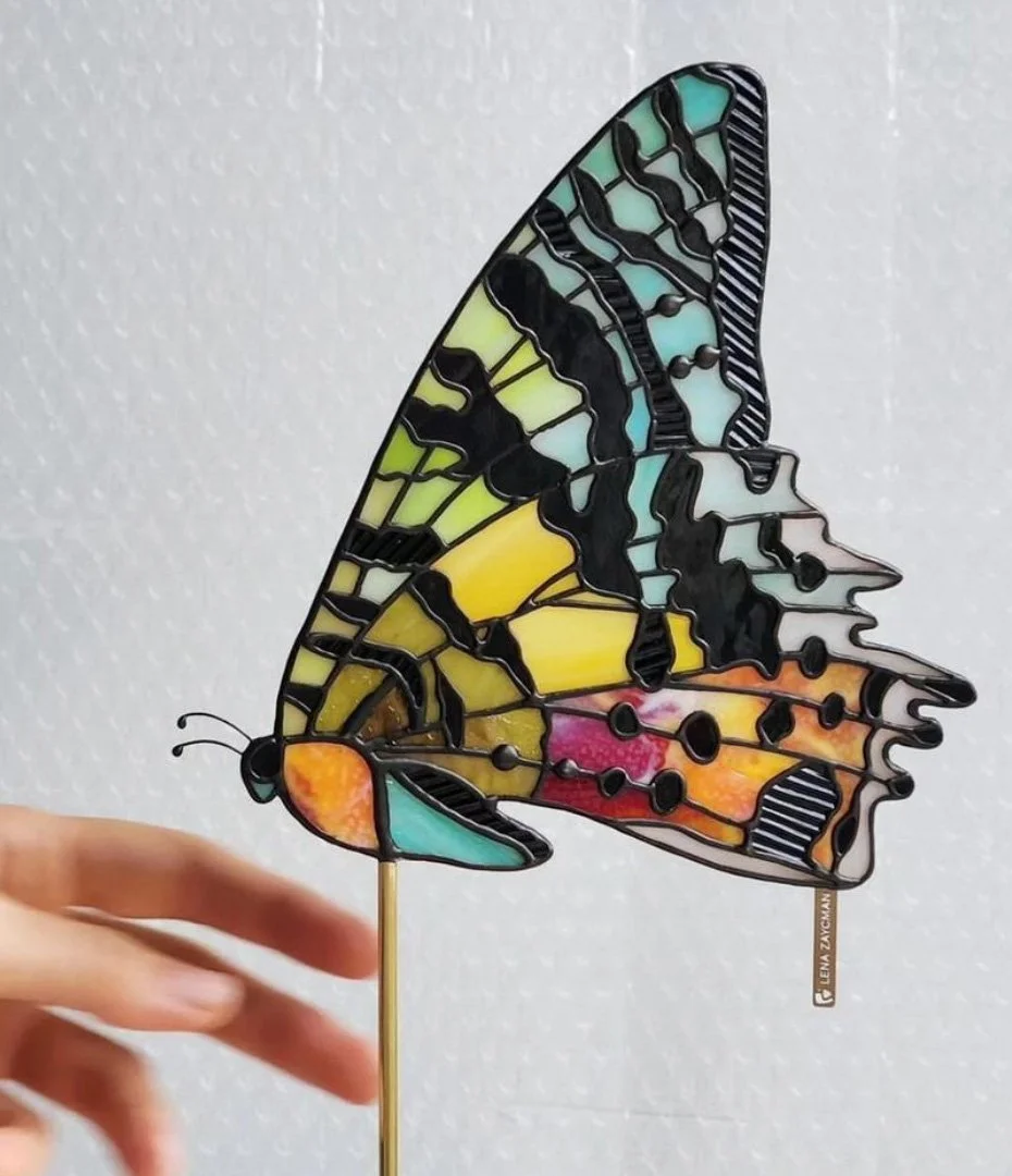 Living in East Los Angeles and working as a hairstylist and makeup artist in Hollywood since 2002, Chevonne Ariss had a full and exciting fashion, editorial, and commercial freelance career that lent itself to world travel and exploration. When she wasn't on set, she was working at a high profile salon, Goodform of Hollywood, with a client list of industry heavyweights. In 2015 she took a break from all that to embark on her greatest, most fulfilling and proudest journey of all, motherhood. Soon after, the craft of stained glass artistry was passed on to Chevonne by her mother-in-law, Claudia Ariss. After spending weekend intensives in Claudia's glass studio in Nipomo, California, Chevonne had the passion and interest to take up stained glass classes closer to home in Los Angeles. "After having my baby and not having the daily creative outlet of hair and makeup, I found a new medium in glass that ignited an overwhelming artistic drive and excitement. Utilizing my extensive study and application in the salon working with color theory, shaping and design has greatly influenced the textures, balance, patterns and colors in my glass work." After a year of studying under the guidance of Claudia and her LA teachers, she was ready to start the venture of showing and selling her pieces in gallery shows, online, and at a handful of high end retail stores throughout Southern California. Firstly, a series called "Jupiter's Moons" aptly named for the 65 moons orbiting Jupiter. Followed by her secondary series of 53 pieces, “Moons of Saturn.” After a move with her family to the Pacific Northwest, the next chapter for Chevonne in her now 6 year stained glass journey was teaching workshops out of her Portland, OR glass studio. “Teaching has been such an unexpectedly fulfilling experience. Introducing this beautiful craft that is so close to my heart to a new generation of artisans is something I hope to do for many years to come.” In early 2021 The Arisses once again relocated, this time to the east coast. You can now find Chevonne settling into her new home and setting up her studio in Western Massachusetts with her wonderful husband, Zandy, daughter Sequoia and their three dogs. “I’m eager to dive even deeper into my stained glass journey as an artist and teacher. There’s a whole new world here in The Berkshires of inspiration, opportunity and artist community. I’m excited and ready to experience it all!” Materials used for all work are glass, stone, zinc, lead & copper.